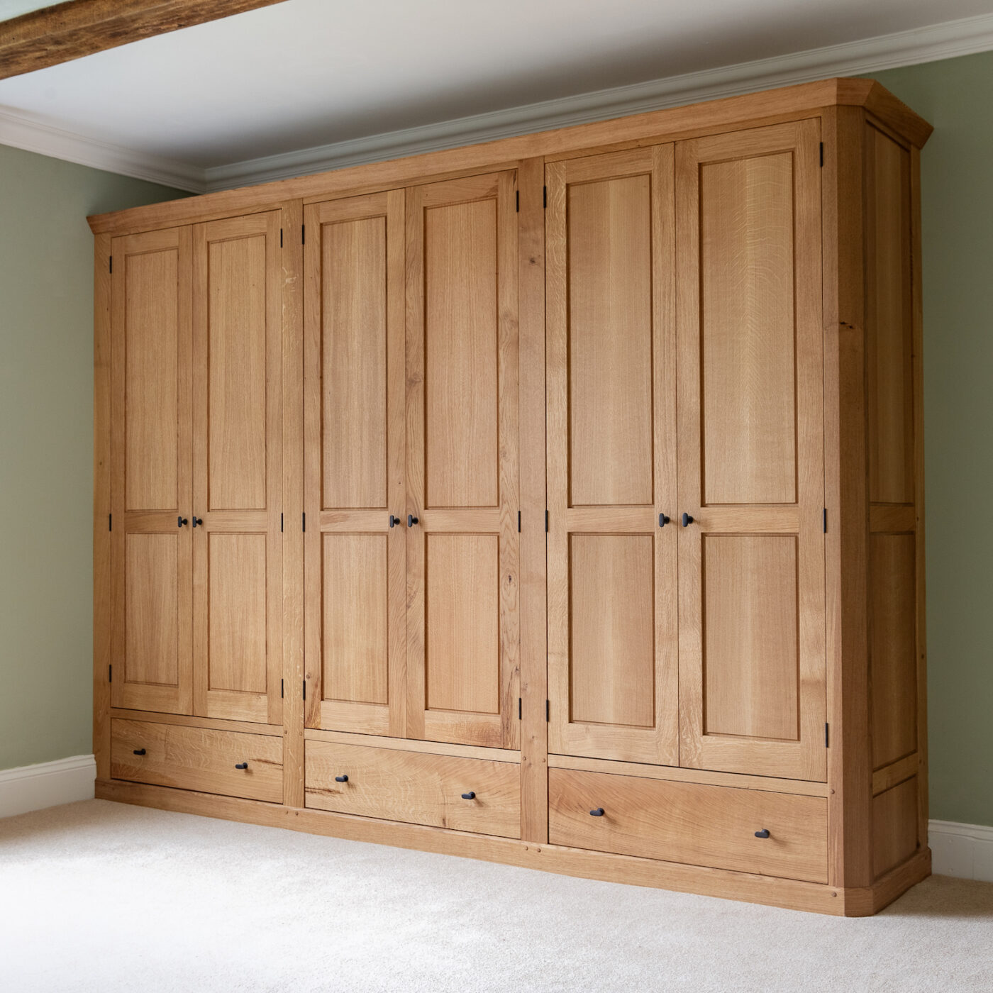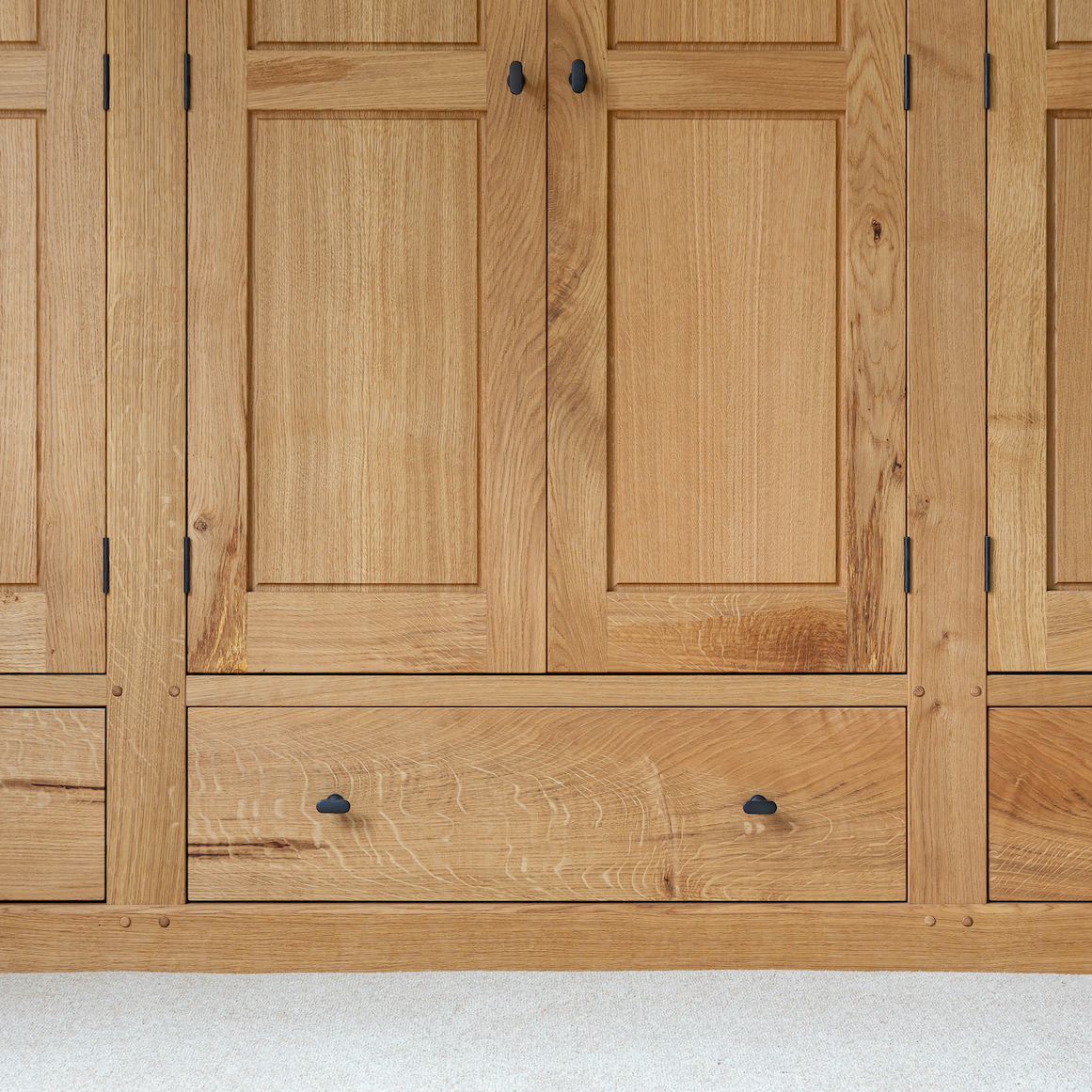 These oak wardrobes were commissioned for a Georgian farmhouse where the client wanted them to be in-keeping with other traditional features of the house but retain a subtly contemporary feel. Using English Oak with plenty of character, traditional joinery and solid book-matched panels gives a rustic yet refined edge. Subtle detailing with clean unfussy lines means these wardrobes are as at home in this period farmhouse as they would be in a contemporary townhouse. An example of authenticity in material and making leading to a timeless aesthetic which can hold its own and be sympathetic in any setting.