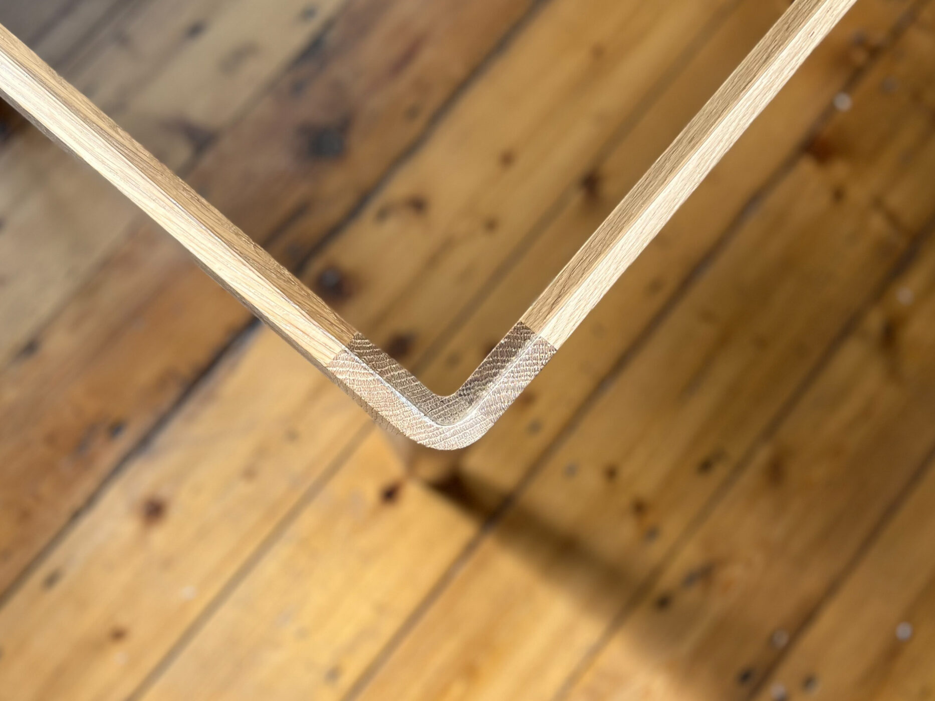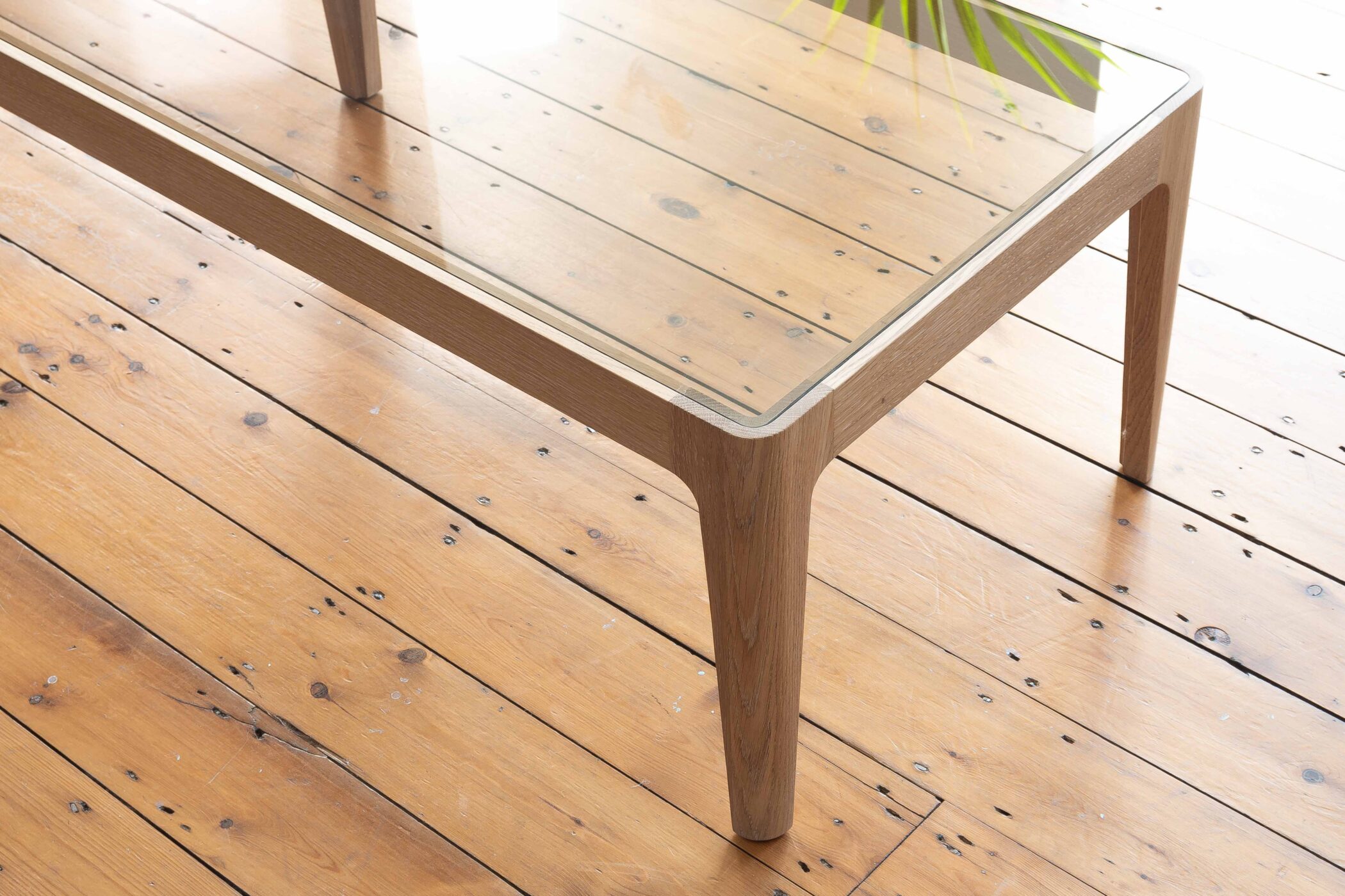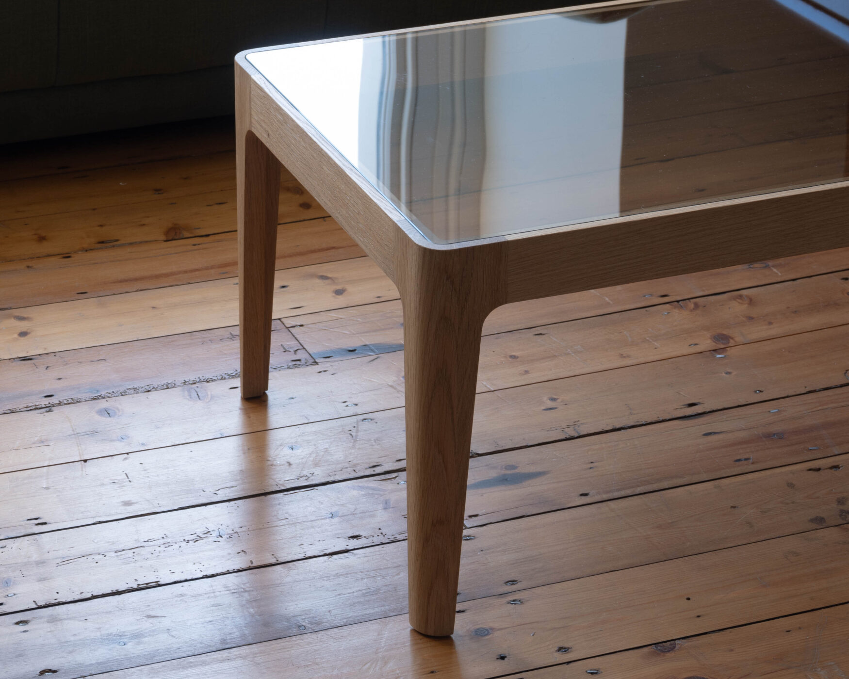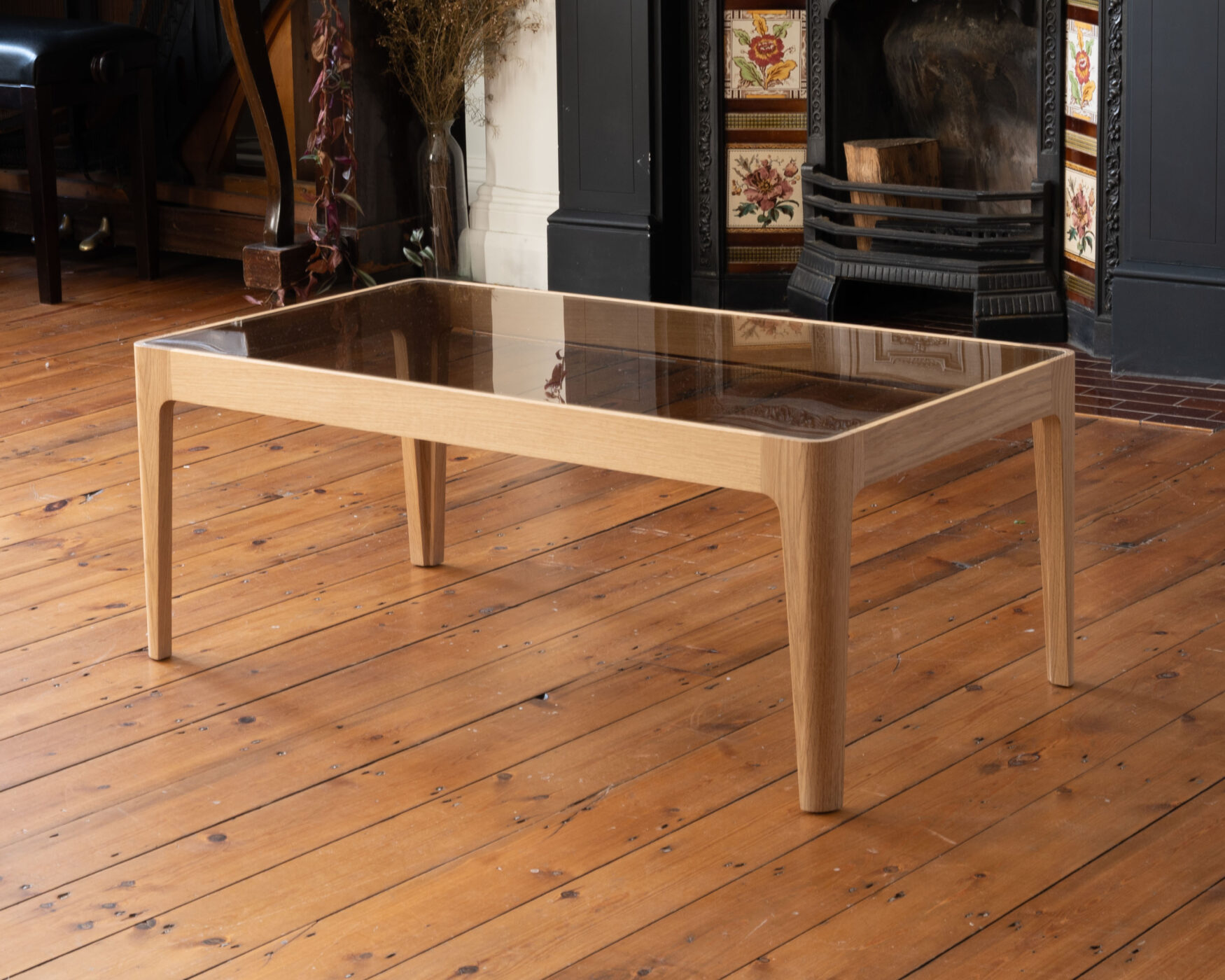 Low oak table with a bronzed glass top.
